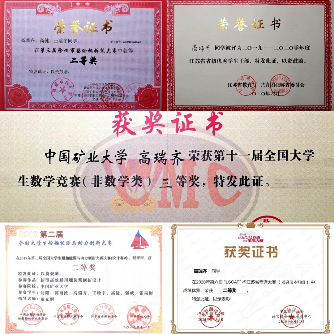目前高瑞齐获得了全国大学生船舶能源与动力创新大赛二等奖,徐州市柴油机拆装大赛二等奖等多项奖项,对他而言,参加比赛绝不是浪费时间,而是对时间的充分利用,“机会会留给有准备的人”,在做每一项工作前,他都会提前计算好时间,防止到时候手忙脚乱。紧凑的生活,让他很充实。