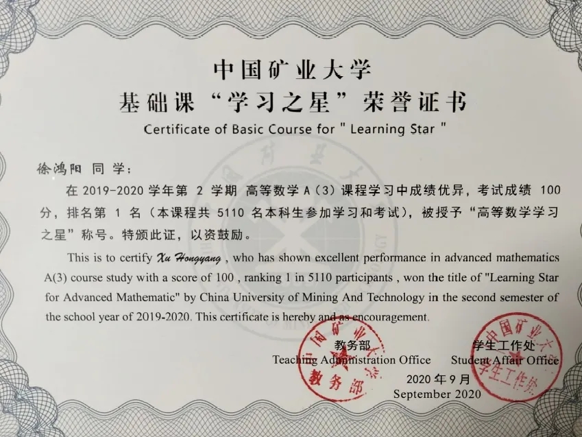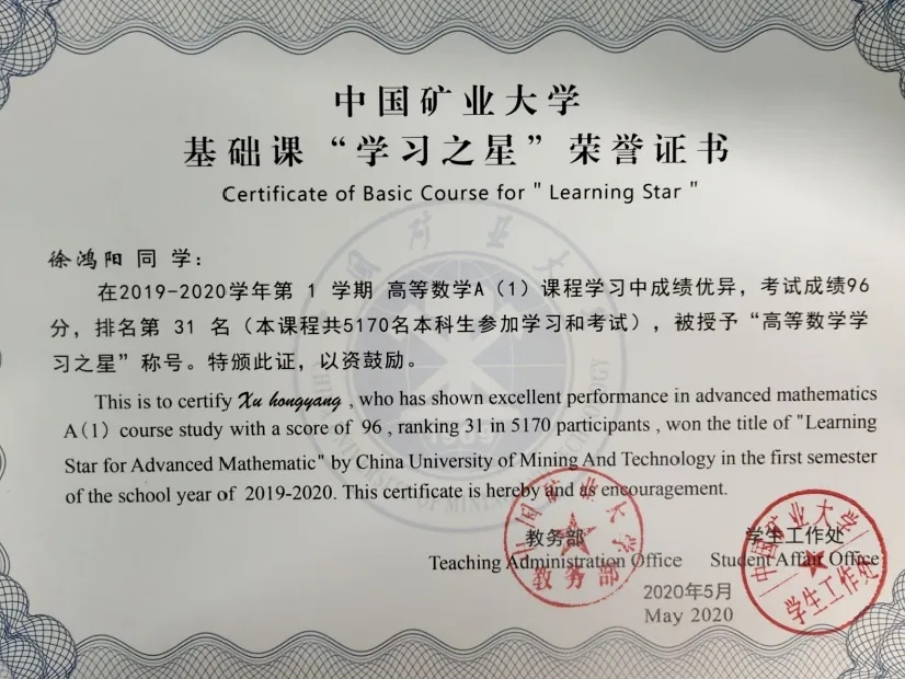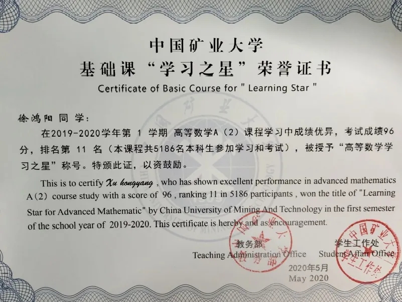 在大一期间,当身边的同学都在为高数学习而感到苦恼之时,徐鸿阳同学却先后取得了高等数学A1、A2、A3的基础课学习之星等荣誉。对于大学中的学习,徐鸿阳同学有着自己独特的一套学习方法。