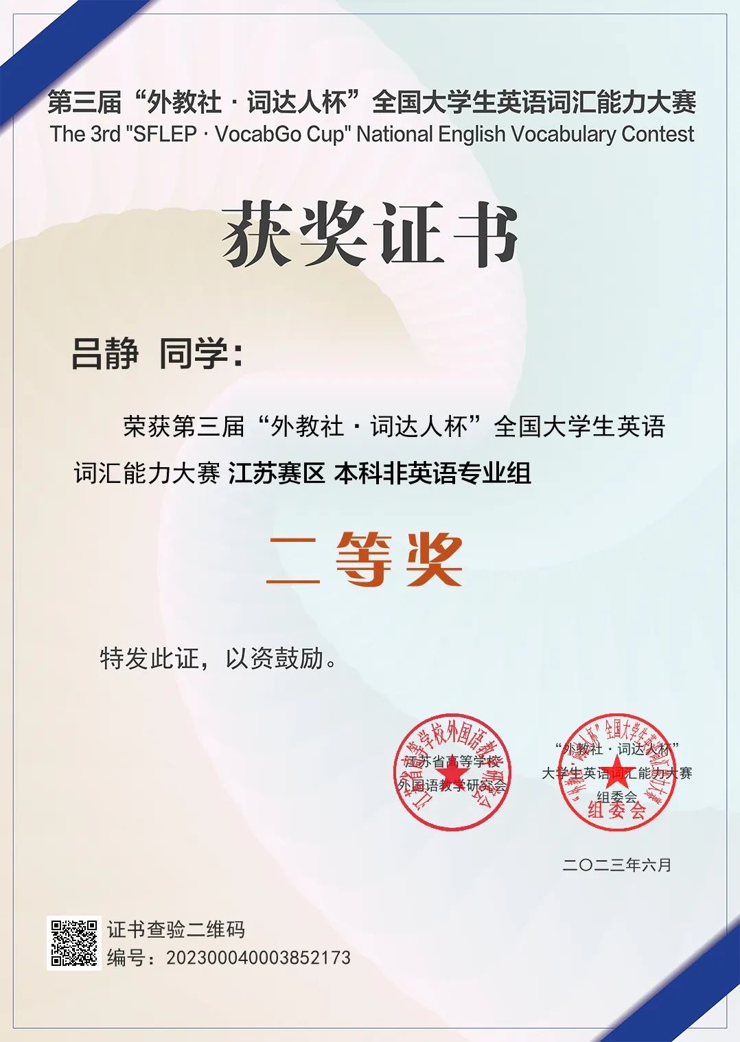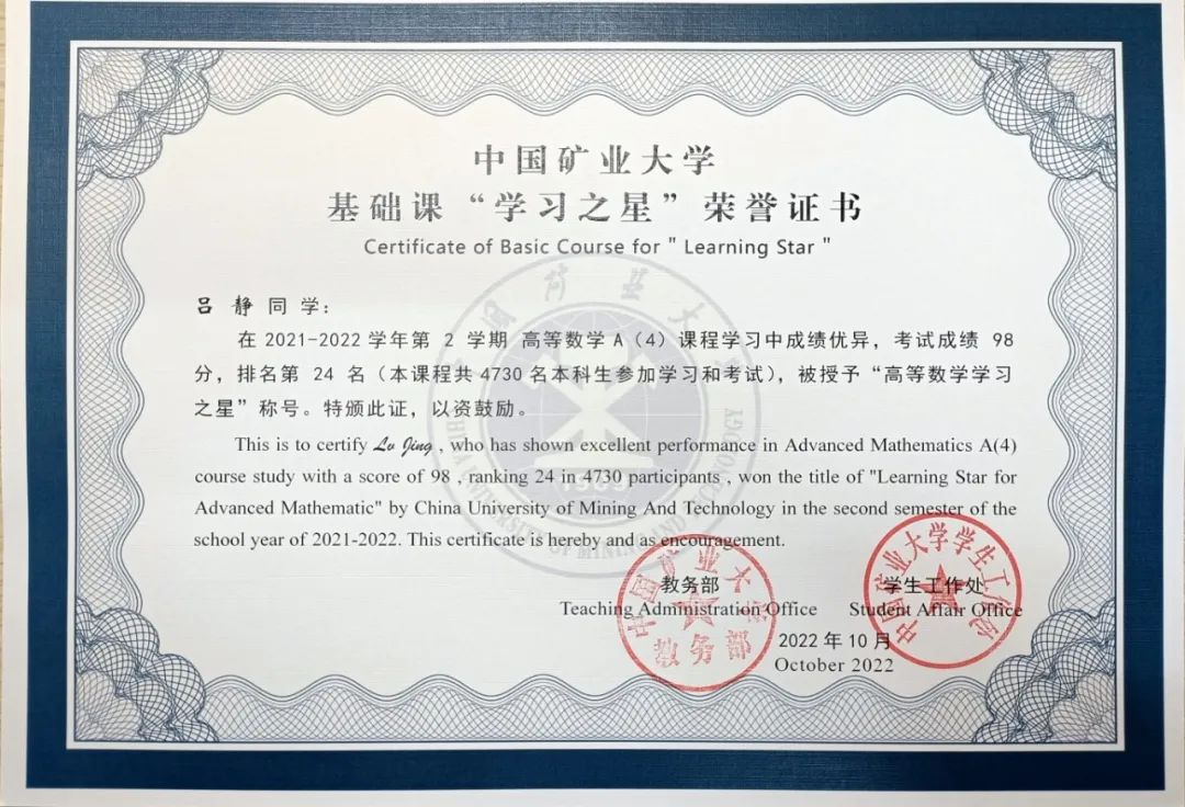 吕静,女,中共预备党员,澳门六合彩资料网站-新澳门六合彩内部资料 2021级智能制造工程专业学生。获2021-2022学年国家奖学金、全国大学生英语竞赛二等奖、江苏省“外教社·词达人杯”二等奖、中国矿业大学基础课“学习之星”等荣誉。