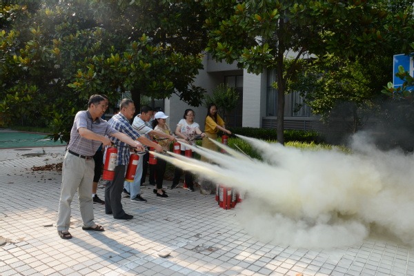 会后大家一起来到灭火演练现场进行灭火演练。王锐老师演示了灭火器的使用方法和注意事项,参加培训人员分成若干小组,在保卫处老师的指导下使用灭火器灭火。