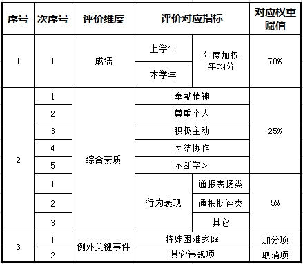 3、个人本年度加权平均分相比上年度增幅比率为第一名的,计100分,每低于一个名次降低2分。(二年级学生评价成绩为大一上下两个学期,方法同前)