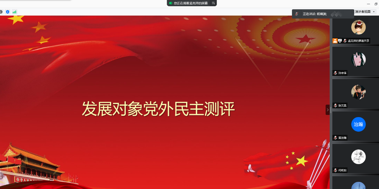 随后会议进入第二项,对班级发展积极分子于乃尚、代思尧、杨博渊、陈士豪同学进行发展对象党外民主测评,四名同学分别发言,表达自己对于帮助班级同学,为班级做贡献的强烈愿望,同时也表示会加强自身能力,提高思想觉悟。最终在党外民主投票后同意发展四人为发展对象。