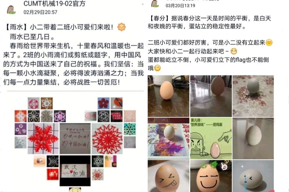 2月17日至3月27日,澳门六合彩资料网站 2019级2班团支部以“雨水、惊蛰、春分”三个节气为时间轴,举办“剪纸-抗疫-竖蛋”系列线上团日活动,团支部全体成员参加。