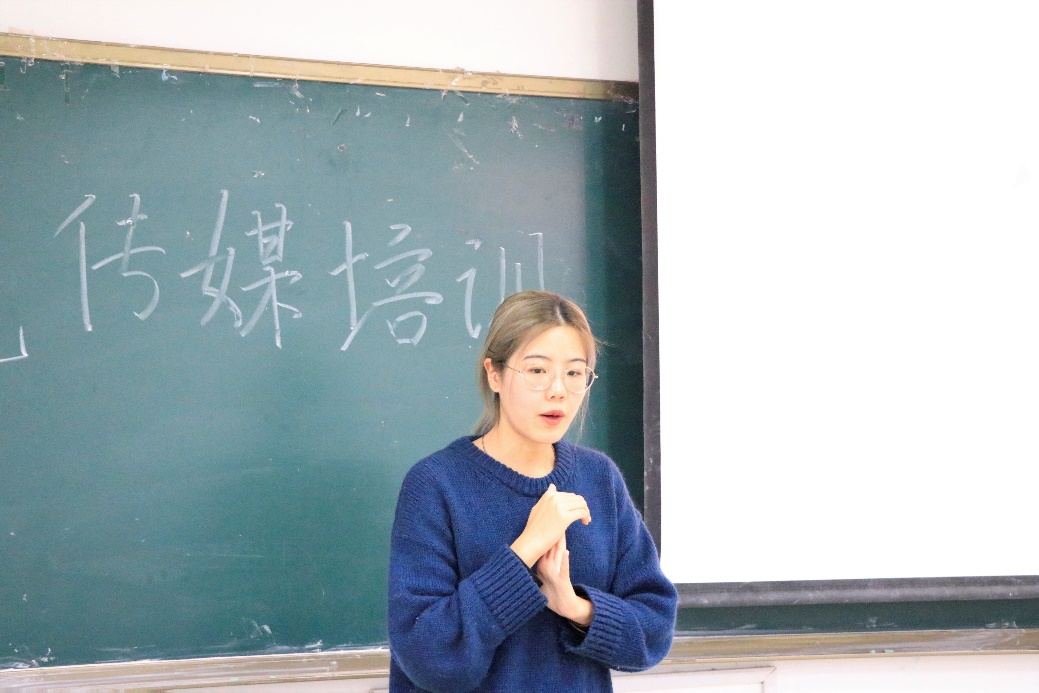 培训会上,刘明心同学以通过她以往拍的照片素材为实例,结合自己在新闻摄影过程中的经历和获得的经验,从运动场、篮球场教室等不同场景为同学们详细讲解了新闻摄影的注意事项,并强调了在新闻摄影中构图完整和内容真实的重要性,同时也分享了在动态过程中拍照的技巧。在培训过程中,传媒中心部员们就新闻摄影位置、新闻配图的要求等方面进行了提问,刘明心同学也耐心地解答了部员们的问题。