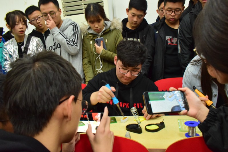 宣讲培训会伊始,李子昊同学向同学们进行了“初识电子元件与焊接入门”的电焊培训。他以各种电子元件的介绍引入,以电路图的讲解作为拓展,将如何焊接好电路板的各种知识点展现给了初涉焊接的同学们,并重点指出焊接时的错误做法。随后,在澳门六合彩资料网站 科技创新协会与机器人俱乐部的组织与指导下,同学们进行了现场电焊实践学习,实时实地将理论知识转化为实际体验,加强了同学们对电子知识的了解,使同学们初步掌握了基础电焊技能。