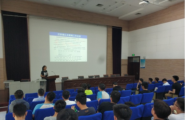 接下来,15级兼职辅导员邵楠主持了2019届毕业生国家助学贷款“诚信教育”报告会及宣誓仪式,主要内容为给部分在大学四年申请过国家助学贷款的学生强调还款事宜以及诚信宣誓。