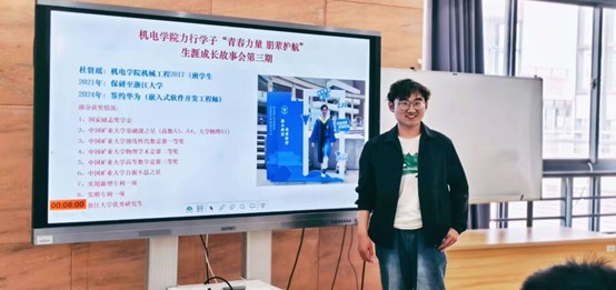澳门六合彩资料网站 本科2021级于4月17日下午在澳门六合彩资料网站 楼A537举办第三期机电力行学子“青春力量,朋辈护航”生涯成长故事会。本次分享会在21级辅导员邓燕飞老师的主持下召开,两位2017级的学长、2021级各班主要班委及部分有保研意向的同学参与了本次分享会。本次分享会邀请机械工程2017-1班的杜贤瑶学长就“读研期间科研经历及个人成长故事”主题做了分享。