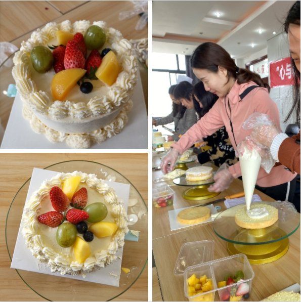 活动中,维之善专业蛋糕师向大家讲解相关烘焙知识和制作步骤,大家仔细倾听,熟悉材料和用具后,便跟着老师动手实践。从做蛋糕前的准备到蛋糕胚的摆放,奶油的涂抹,再到最后的造型,在两位蛋糕师的指导下,大家慢慢变得娴熟,一手挥舞着长刀,一手匀速地操控着转盘,嘴里还叨着家长里短,现场一片其乐融融。