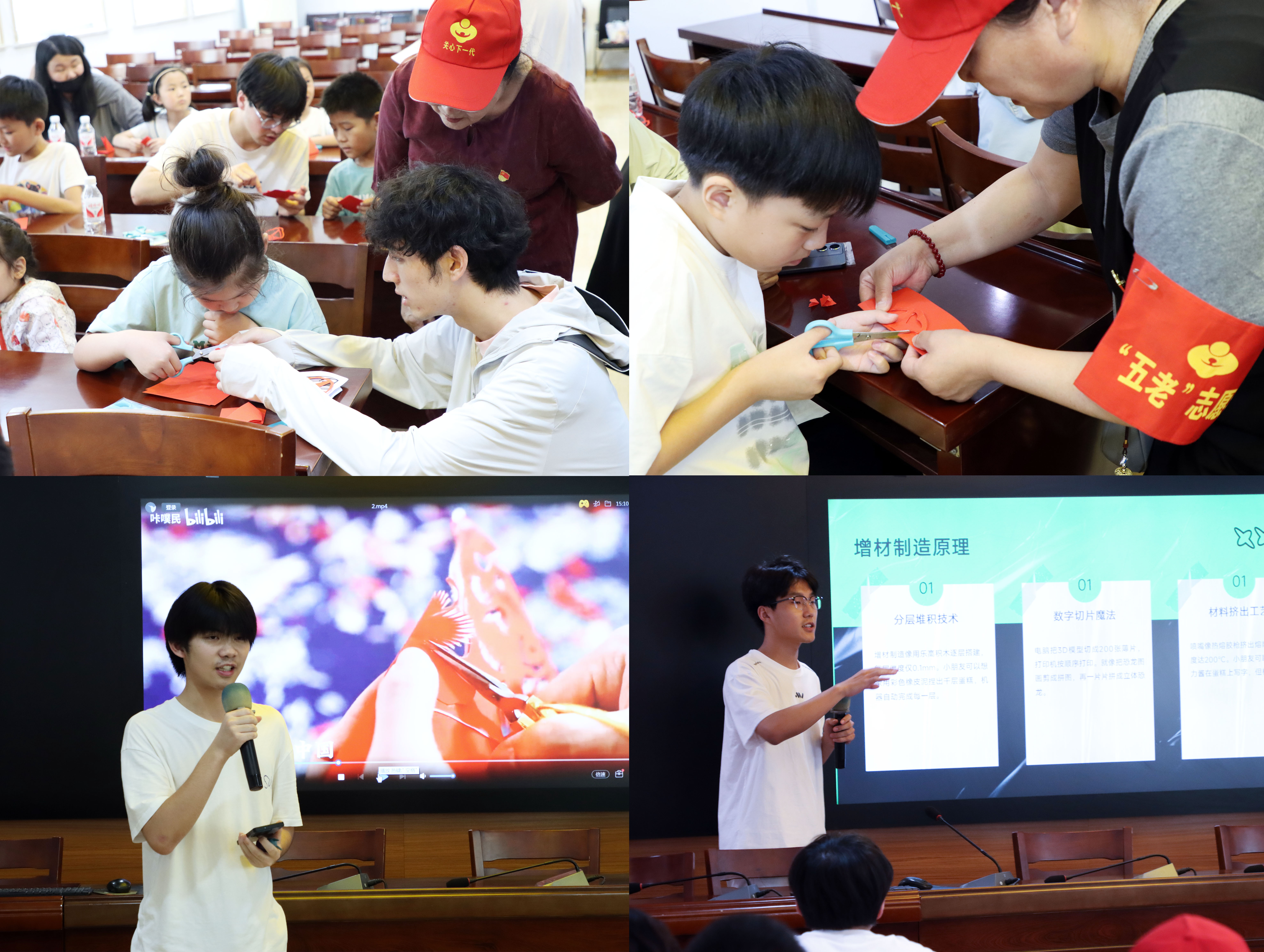 本次活动由志愿者面向下淀社区招募的初中生开展党史教育与科普活动。首先通过党史教育短片,讲解中国共产党成立纪念日的历史背景,视频内容生动展现了党的光辉历程和伟大成就;随后进行工程图学基础知识和AutoCAD软件操作讲解,志愿者通过现场演示帮助中小学生理解制图原理,并组织剪纸实践活动,将传统工艺与现代设计理念相融合;最后结合视频演示和互动环节,科普三维建模和3D打印技术知识,让中小学生直观感受先进制造技术的应用场景。
