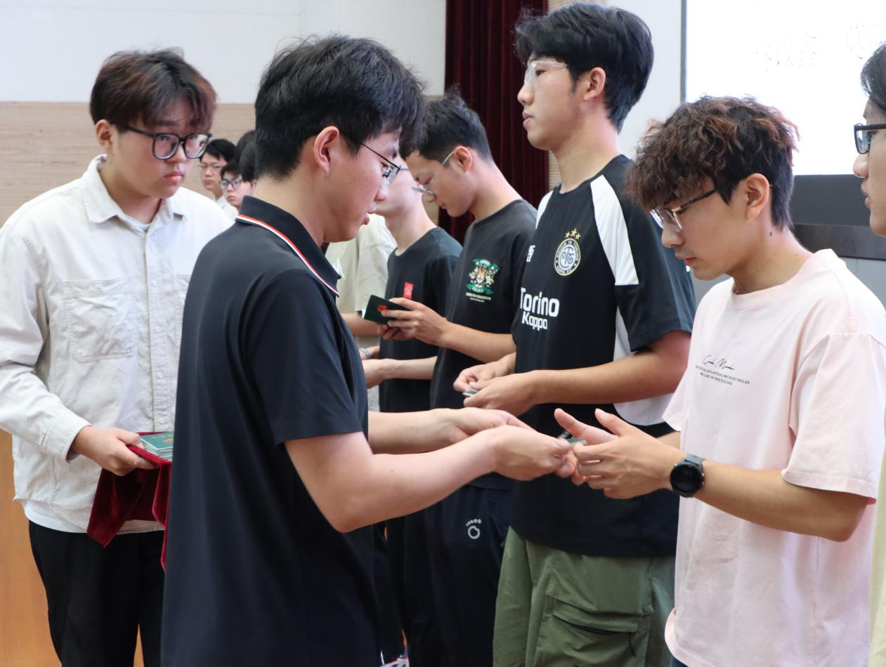 活动伊始,全体人员肃立,齐唱国歌,表达对祖国、中国共产党和中国共产主义青年团的热爱与忠诚。随后,主持人郭一鸣宣读了新发展团员名单。院团委书记汪凯和辅导员吴丹妍共同为新团员颁发团员证和团徽,并为他们佩戴团徽。闪亮的团徽佩戴胸前,象征着红色精神的传承与接力,也标志着新团员正式加入了中国共产主义青年团的光荣行列。