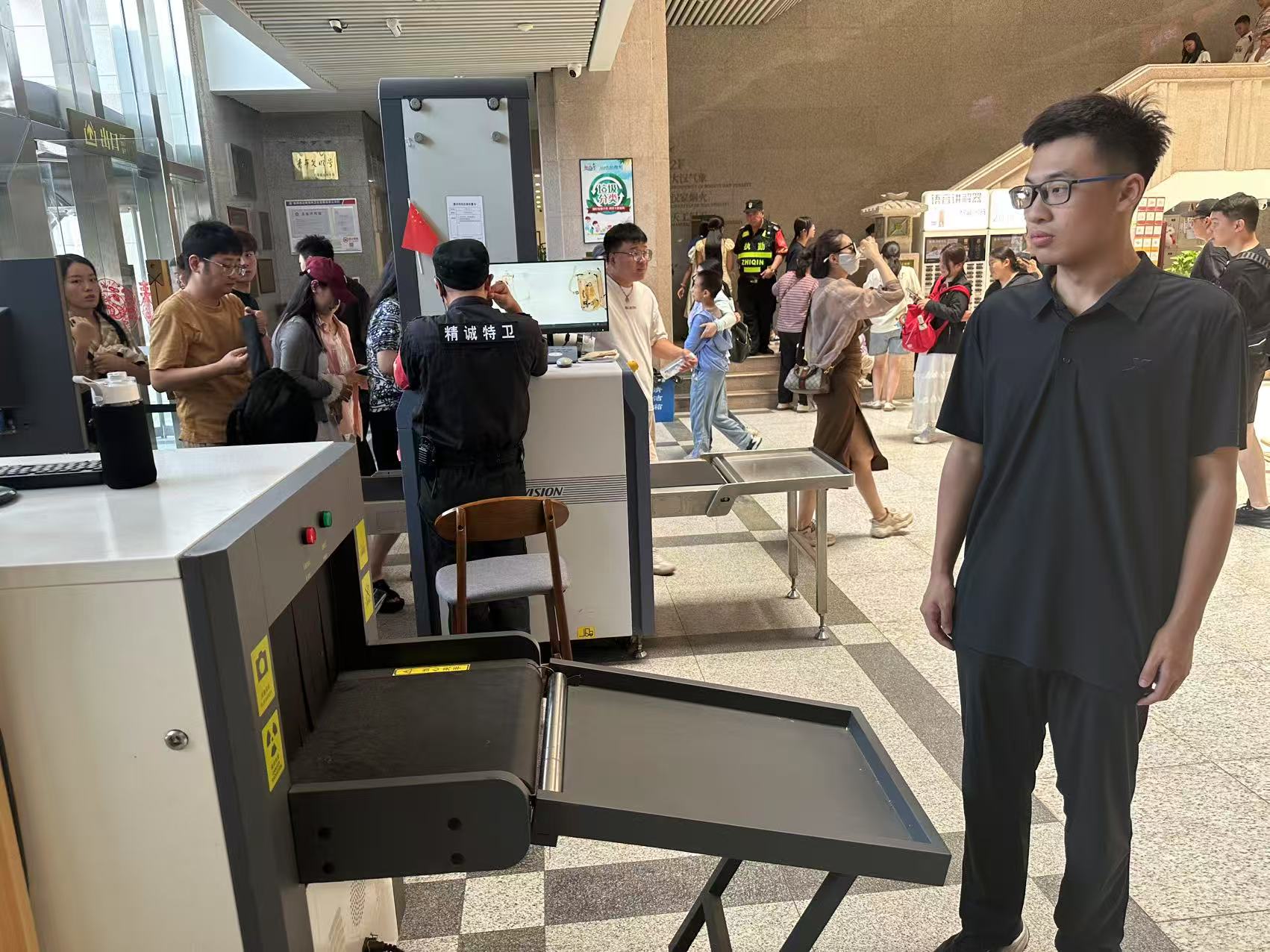 此外,志愿者杨悦涵和田丰恺负责博物馆大门的安检及引导工作。他们耐心地为游客解答疑问,维持入场秩序,确保参观流程顺畅有序。他们的细致服务为博物馆的安全运营提供了有力保障。