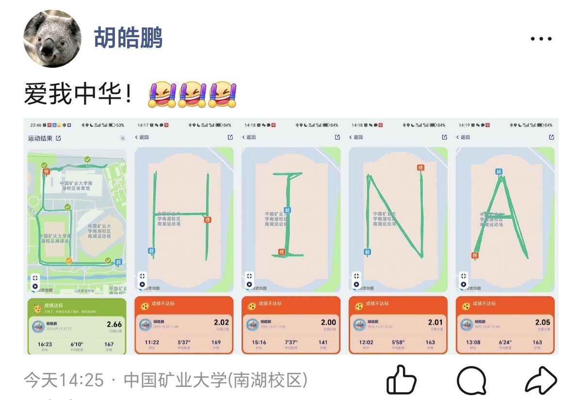 活动采用 “线下跑步 + 线上打卡” 的创新形式,鼓励同学们在跑步过程中,通过运动轨迹绘制出 “China” 字母或 “2025” 数字等具有象征意义的图案。参与者需将跑步截图上传至群相册,最终将完整轨迹拼接成祝福图文分享至社交平台,形成具有仪式感的集体献礼。这一形式将体育锻炼与爱国教育有机融合,既强健了体魄,也增强了同学们的参与感与创造力。活动期间,同学们踊跃参与,充分发挥想象力与团队协作精神,在奔跑中表达对祖国的热爱。一幅幅由脚步绘就的轨迹图,不仅是运动的记录,更是青春告白祖国的生动体现。活动设置的志愿时长认定与纪念品奖励机制,进一步调动了学生的积极性,营造出积极向上、爱国荣校的校园氛围,也为同学们持续参与提供了动力。