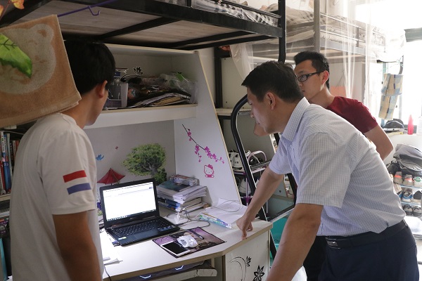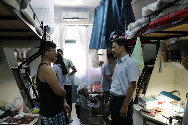 5月27日下午,澳门六合彩资料网站 党委副书记侯德伟以及澳门六合彩资料网站 各年级辅导员认真检查了澳门六合彩资料网站 学生宿舍的环境卫生、安全情况,学校保卫处副处长郭鹏也进入宿舍,细心检查排除了宿舍卫生、用电安全的隐患。