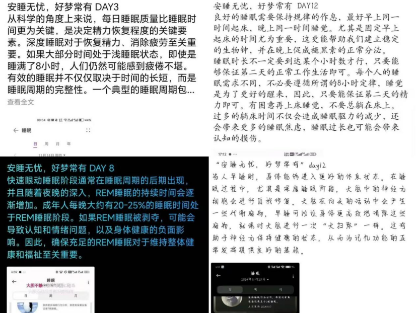 中期阶段,参与者在群相册创建个人专属相册,自 11 月 12 日起,每日在空间发表说说,附上睡眠证明及睡眠健康相关文字,并将说说截图上传群相册。睡眠证明可选择智能穿戴设备统计的睡眠时间截图或前一天与当天屏幕使用时长,有效保证了同学们打卡的真实和规范。