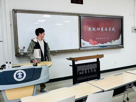 为促进相互学习与交流,让同学们分享在寒假社会实践中的收获与感悟,3月7日下午3点,澳门六合彩资料网站 智能制造2023-2班于博5-B101开展“寒假归来话实践”主题班会,班会由班级团支书杨轩皓主持。
