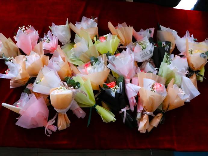 活动伊始,梁佳卉老师讲述了本次活动的主题——“刺”与“花”的辩证法,详细阐述了各种花卉的挑选、鉴别以及培养技巧。随后,活动进入实践环节。从花枝的修剪、花朵的搭配,到花束的包装和整理,梁佳卉老师都耐心细致地进行了讲解和示范。经过一番努力,同学们的花束制作陆续完成。最后,在同学们清理座位并整理现场后,梁佳卉老师针对本次活动主题进行了总结。她回顾了同学们过去的经历,鼓励大家勇敢面对未来的挑战和机遇,努力争取自己想要的生活。梁佳卉老师的话语中,充满了对同学们的期望和关爱,令在场每一个人都深受感动。