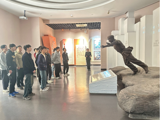 下午,研学团前往邳州王杰烈士纪念馆。在纪念馆内,同学们跟随讲解员的步伐,仔细聆听王杰烈士的英勇事迹。在烈士手稿陈列柜前,泛黄的日记本上"我们要一不怕苦、二不怕死"的誓言穿越时空;全息影像技术还原的"炸药包突发意外"场景,让青年学子真切感知英雄瞬间抉择的信仰力量。在场师生被王杰烈士坚定的理想信念所震撼。