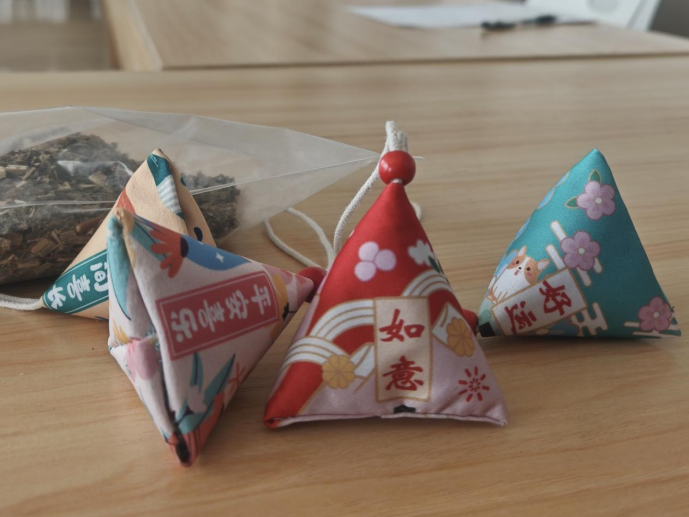 在实际操作中,同学们根据自己的喜好挑选色彩鲜艳的布料,拿取氤氲着草本芬芳的艾草。在制作过程中,大家相互交流,分享平针缝法和藏针缝法的技巧,现场氛围温馨融洽。不多时,一个个造型别致的香包在同学们手中呈现。